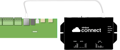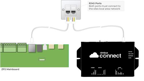 Plug an ethernet cable into the ethernet port of the Nimbus device, and connect to the site supplied RJ45 port. Plug the remaining ethernet cable from the site supplied RJ45 port to the panel.