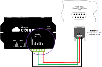 Connect the Female 'D' type connector to the modem port on the panel. Using 3 core screened data cable wire to the Nimbus RS232 as follows.